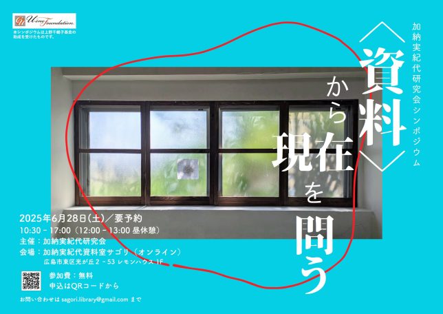 2023年「加納実紀代資料室サゴリ」を開室し、翌年2月に「加納実紀代研究会」を立ち上げました。メンバー(研究者・非研究者半々)は2ヶ月に1回研究会を開き、加納さんの思想と行動そして加納資料を背景に、発表者のテーマをクロスさせて議論を重ねてきました。このたび幸いに上野千鶴子基金から助成金を得ることができ、資料室と研究会をクロスさせる表記シンポジウムを開催することにいたしました。